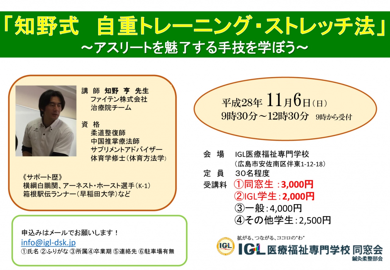 なお、IGL医療福祉専門学校鍼灸学科の尾野龍一先生(ryoichi-ono@igl.or.jp)にメールしていただいても申込みできるそうです。